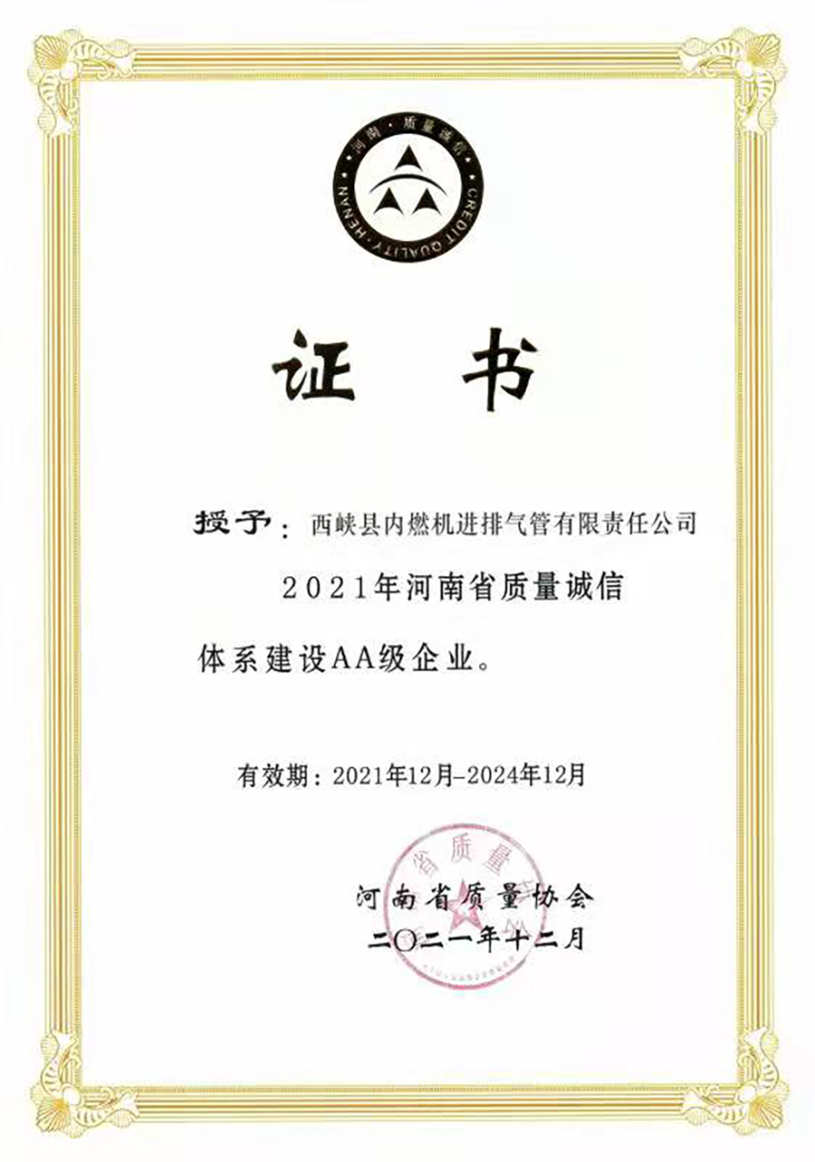 公司被河南省質(zhì)量協(xié)會(huì)授予“2021年河南省質(zhì)量誠(chéng)信體系建設(shè)AA級(jí)企業(yè)”。